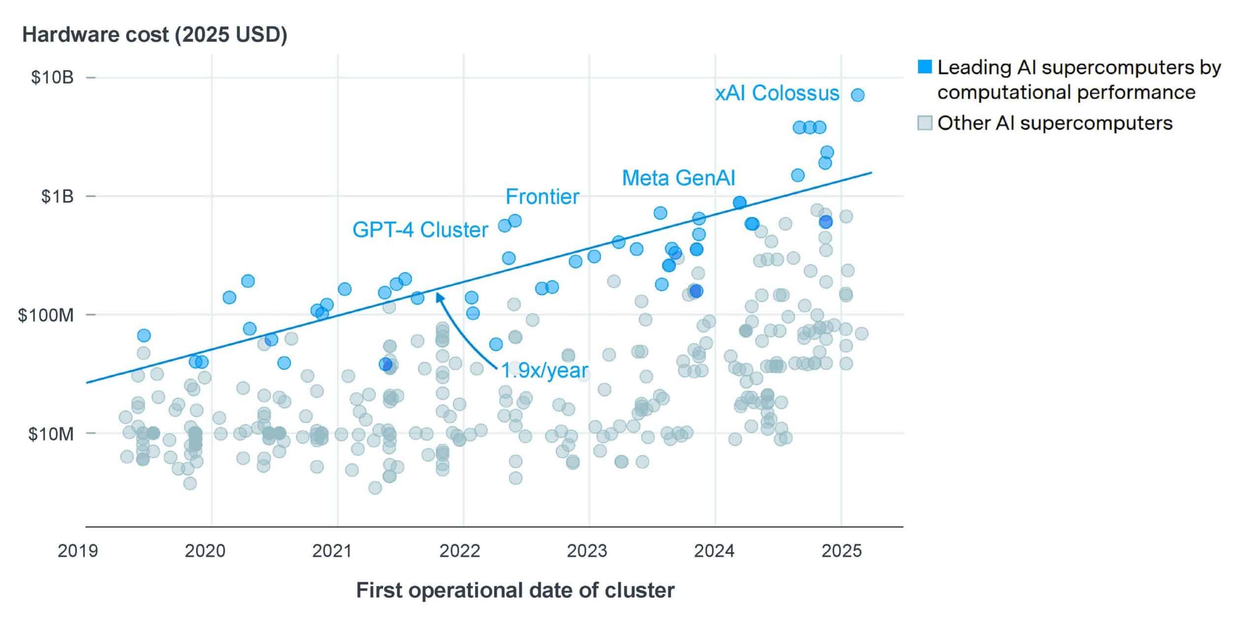 The cost of IT needed to fuel the current AI revolution can only be described as staggering. Funding for the major AI supercomputers—those powering companies like OpenAI and Anthropic—has been doubling roughly every year since they were first built. The GPT-4 cluster alone cost hundreds of millions of dollars, while xAI’s Colossus supercomputer clocked in at $10 billion. And we’re still in the early innings, with ever-increasing demand for AI fueling more infrastructure investment. For those of us who spend a lot of time thinking about where durable value gets created in technology, this trajectory is hard to ignore—and even harder to overstate.