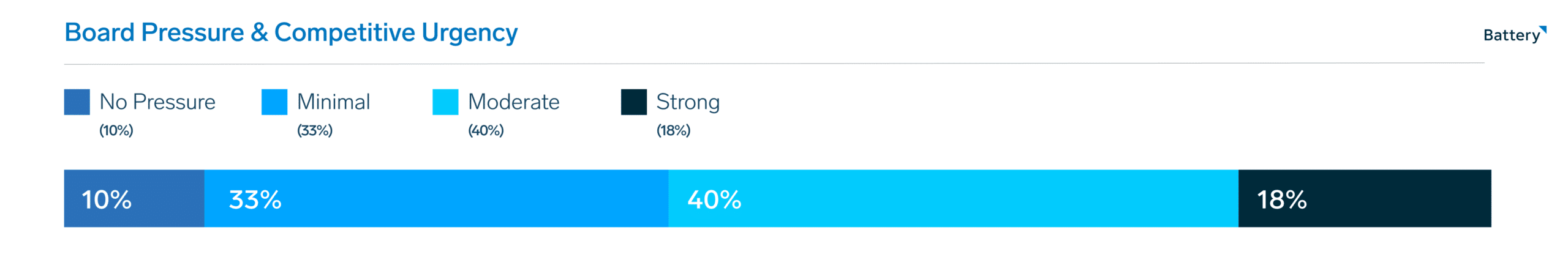 The benefit that financial AI companies have is that they are dealing with motivated buyers under pressure. Fifty-seven percent of CFOs report moderate-to-strong pressure from their boards and investors to move on AI, and 72% expect their overall technology budgets to expand over the next two to three years.