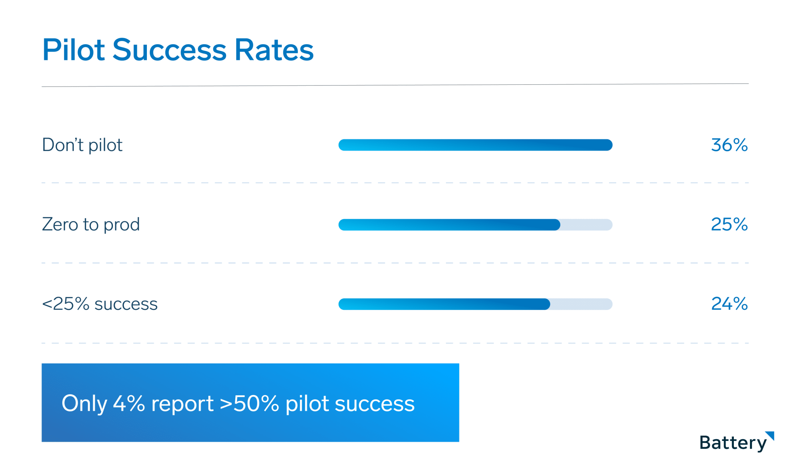 But beneath that pipeline sits a striking failure rate. Among CFOs who have piloted AI, only four percent report a pilot success rate above 50%.