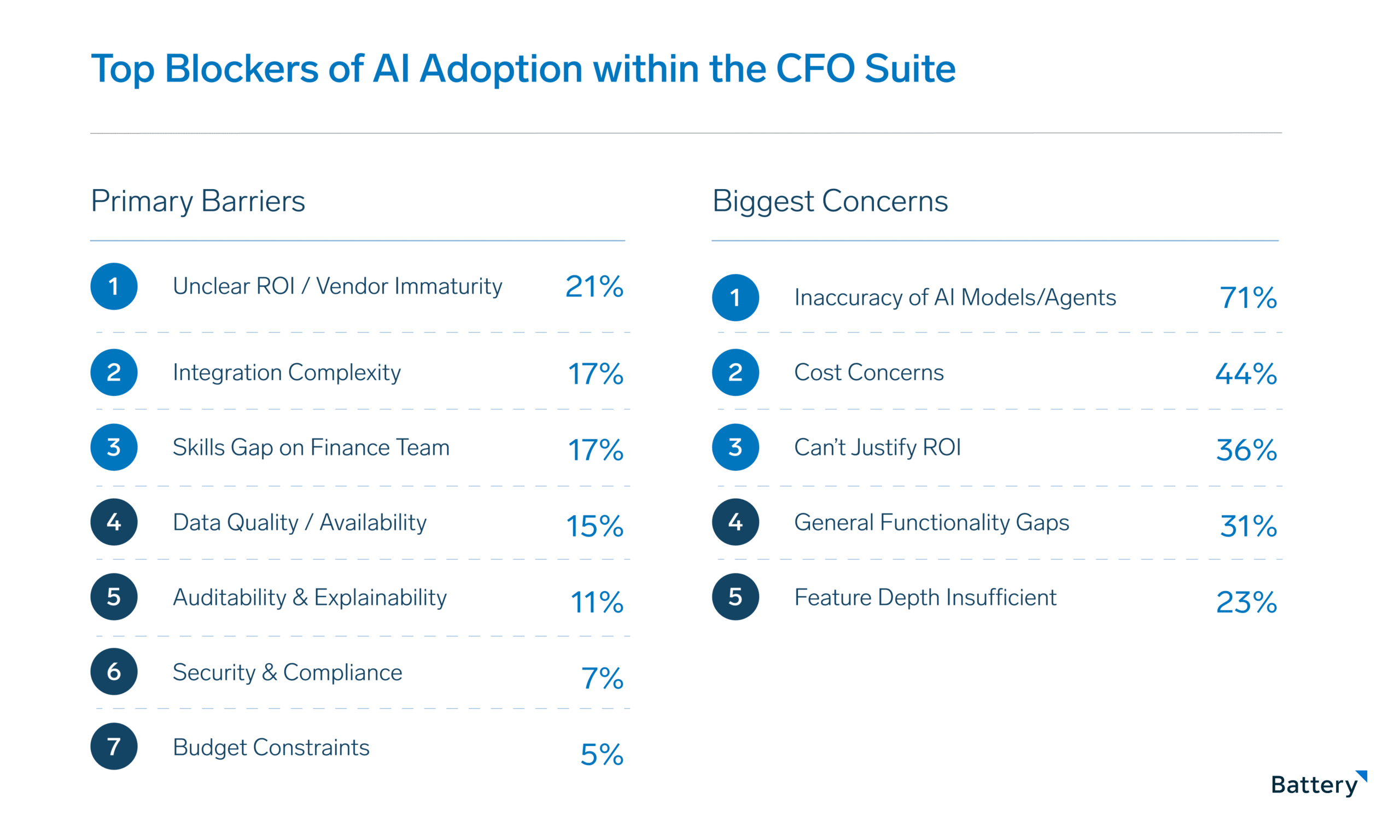 One popular solution many companies are using to solve this problem is leveraging forward-deployed engineers (FDEs). For AI companies selling to CFOs, this model is especially relevant. Finance teams don’t operate in clean, standardized data environments. They run on a patchwork of ERPs, bank integrations, expense systems and Excel spreadsheets, all with different schemas, data-quality levels and integration points. In our view, the companies that will win here are the ones that invest heavily in enablement that can scale, like building data normalization into the product. Our survey data reinforces this: 16% of CFOs cite “too much setup/training required” as their biggest disappointment with current AI tools, and speed-to-value matters more to them than feature breadth.
